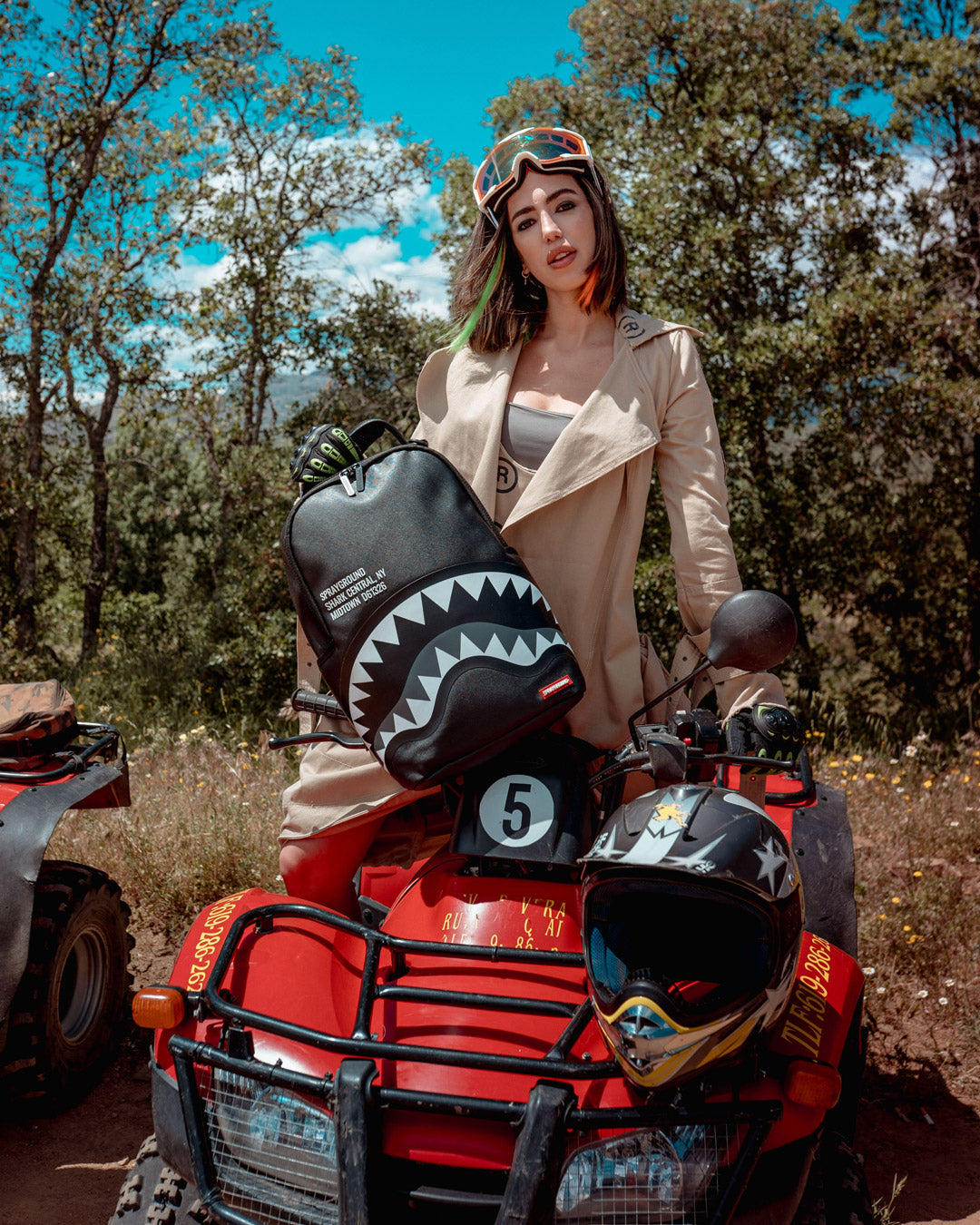 Dimensions: 18" x 6" x 11.5" • Front zipper pocket • Side pockets • Zippered Stash pocket • Separate velour sunglass compartment • Ergonomic mesh back padding • Adjustable Straps for custom sizing • Gold zippers with metal hardware • Metal "Sprayground Authentic" badge • Slide through back sleeve connects to carry-on luggage to free your hands