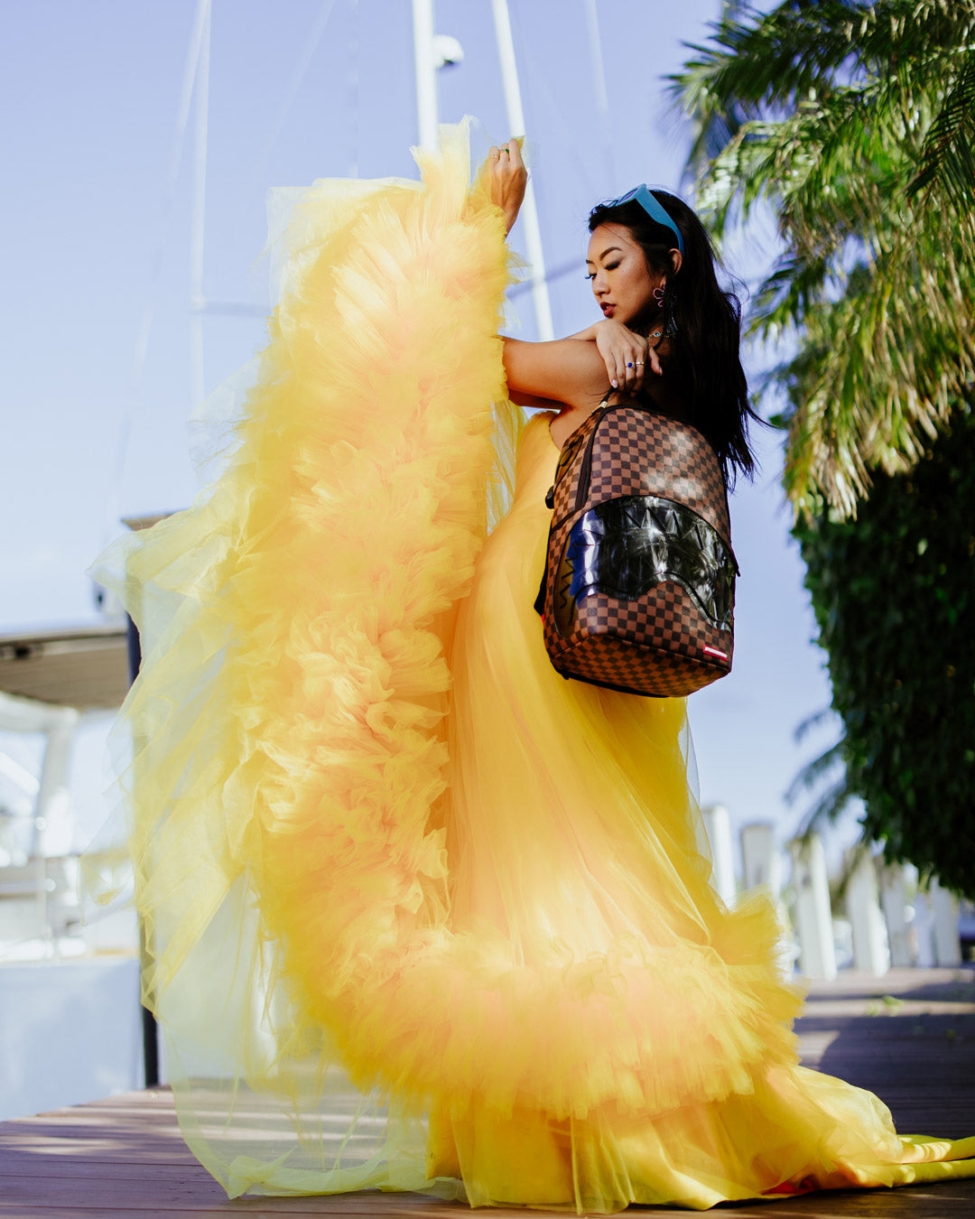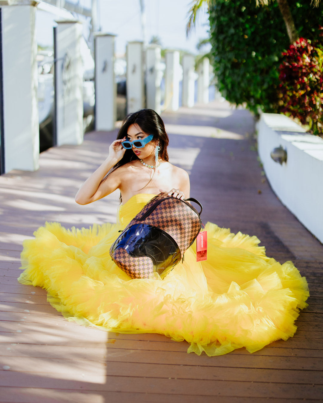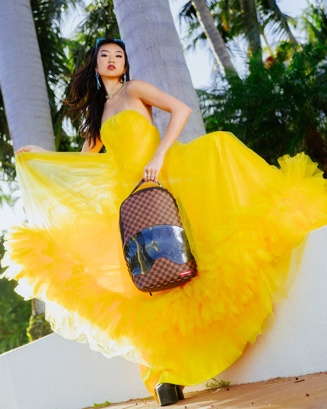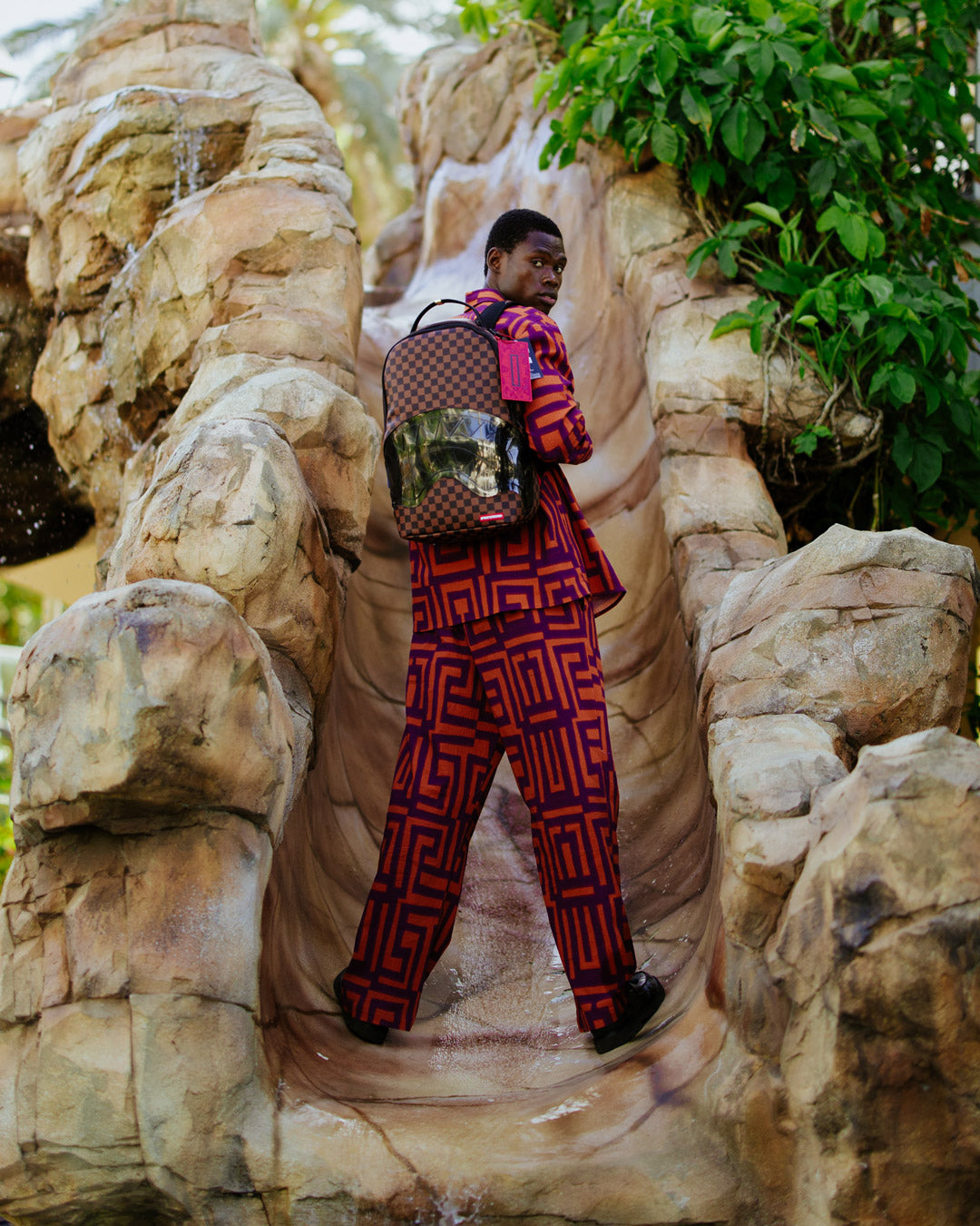 Dimensions: 18" x 6" x 11.5" • Front zipper pocket • Side pockets • Zippered Stash pocket • Separate velour sunglass compartment • Ergonomic mesh back padding • Adjustable Straps for custom sizing • Gold zippers with metal hardware • Metal "Sprayground Authentic" badge • Slide through back sleeve connects to carry-on luggage to free your hands