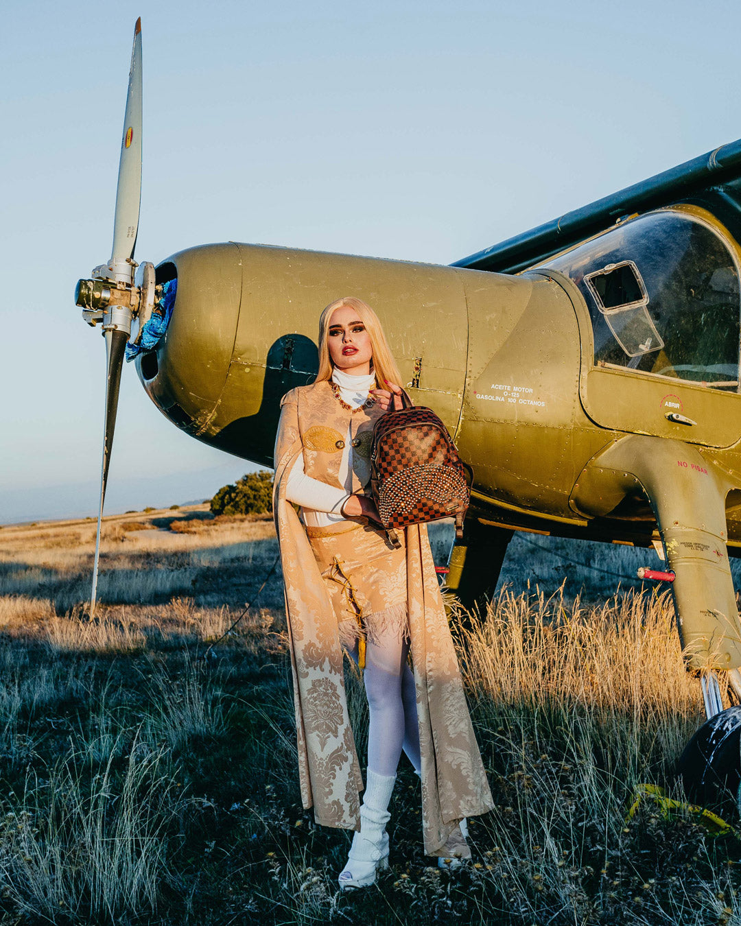 Dimensions: 10" x 5" x 11.5" • Two large main zippered compartments • Side pockets • Zippered Stash pocket • Adjustable straps for custom sizing • Gold zippers with metal hardware
