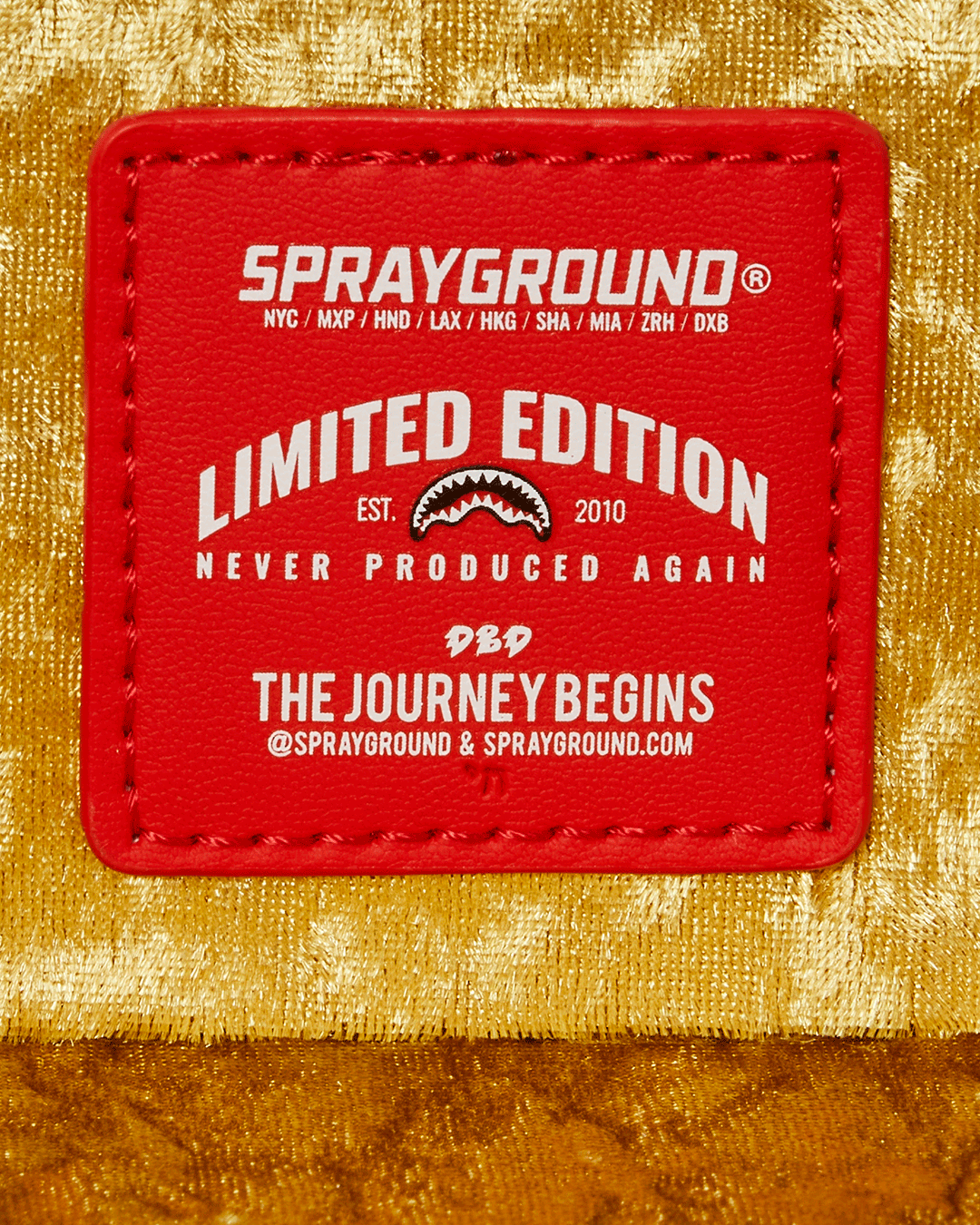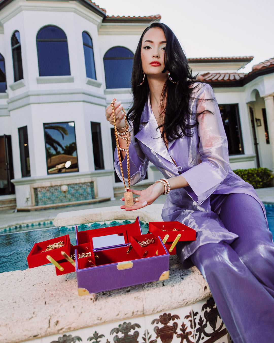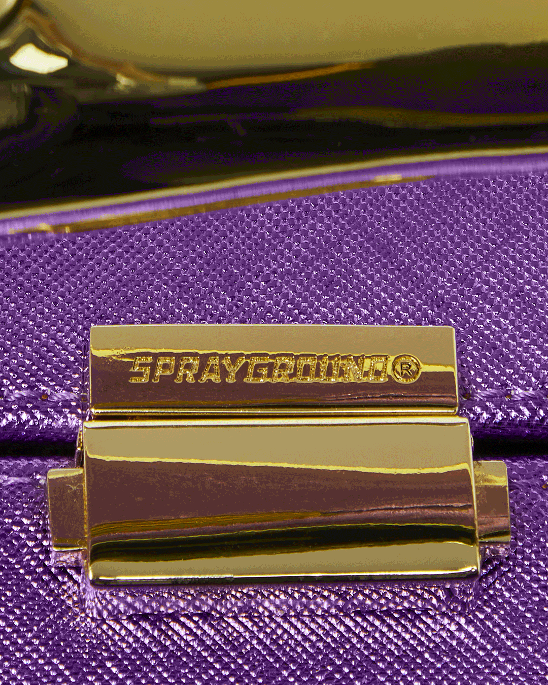 Shimmer and shine! Custom shark molded handle jewelry case with metallic purple fabric and crushed gold velour interior lining
