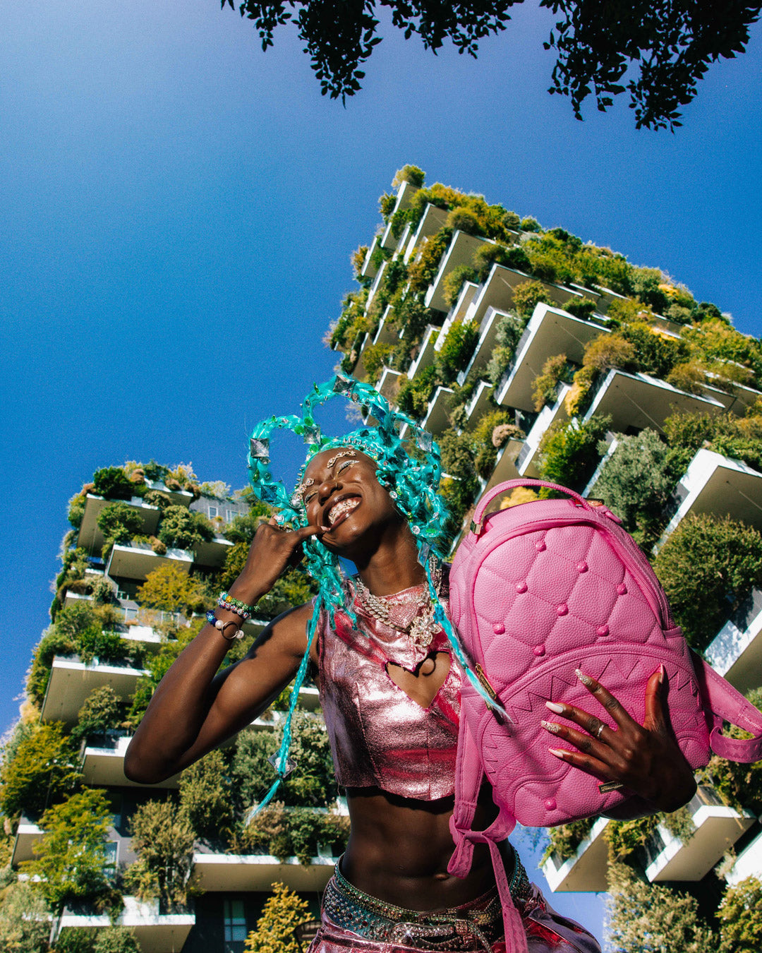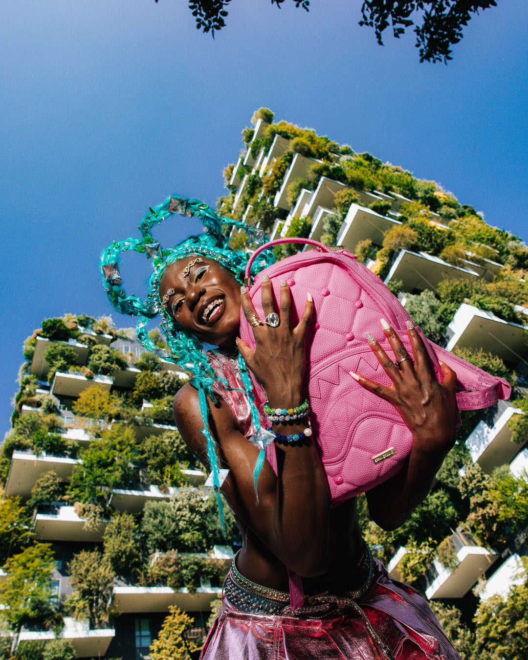 Pink quilted with bear face studs. Pink enamel & gold hardware details