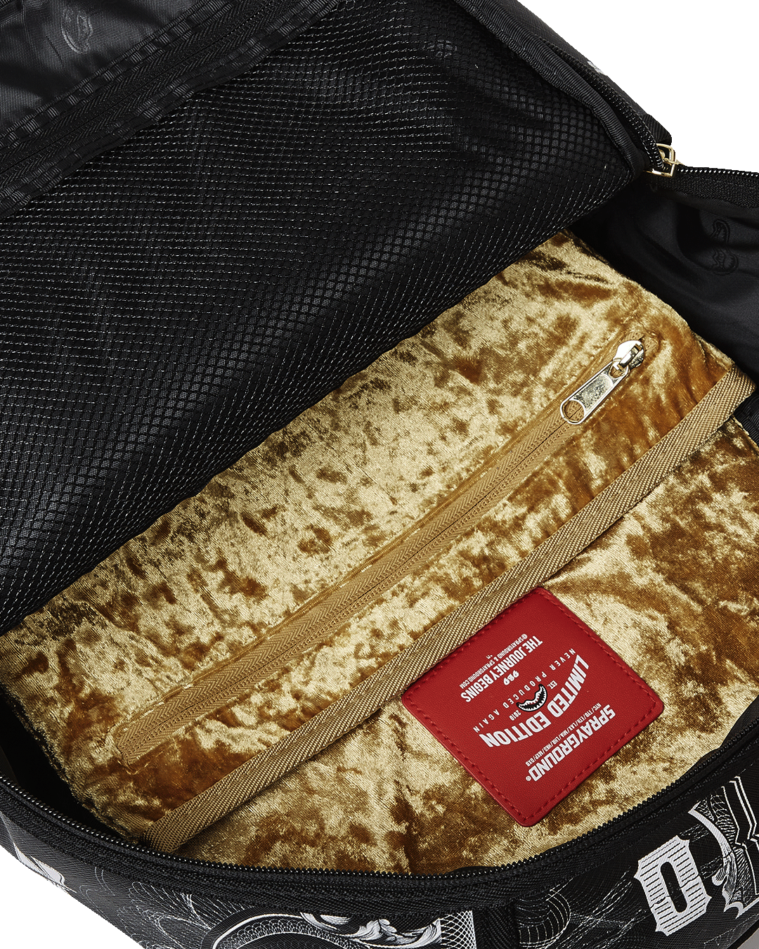 Dimensions: 18" x 6" x 11.5" • Front zipper pocket • Side pockets • Zippered Stash pocket • Separate velour sunglass compartment • Ergonomic mesh back padding • Adjustable Straps for custom sizing • Gold zippers with metal hardware • Metal "Sprayground Authentic" badge • Slide through back sleeve connects to carry-on luggage to free your hands