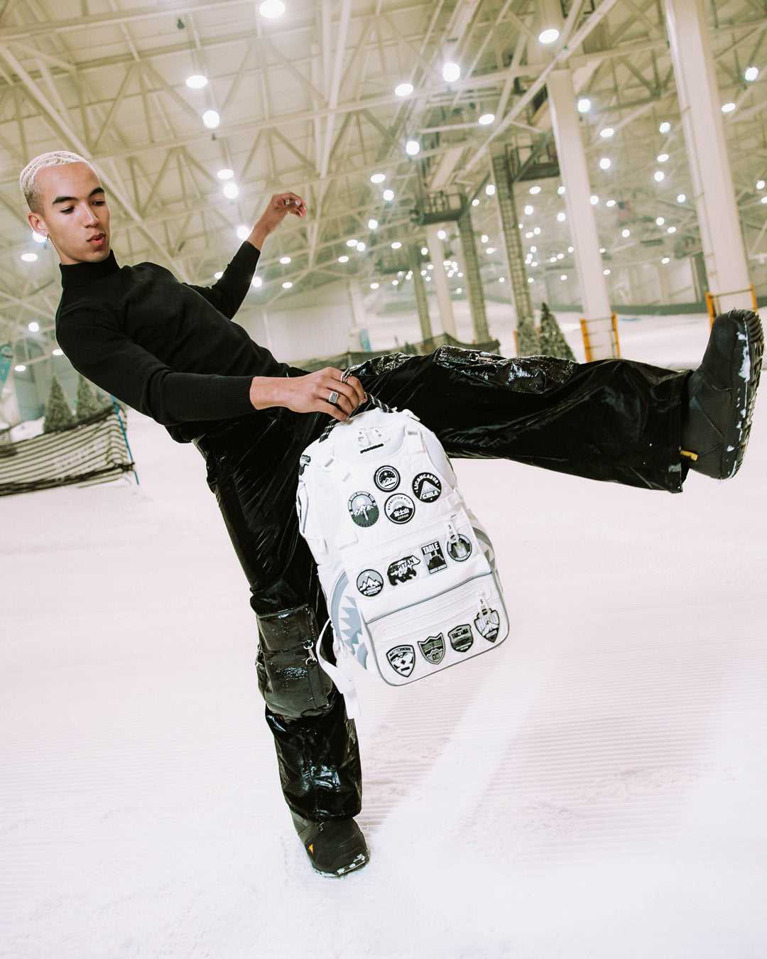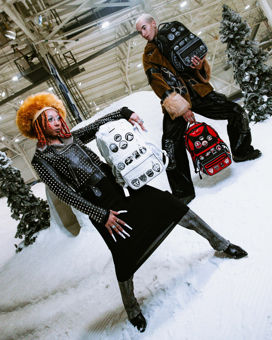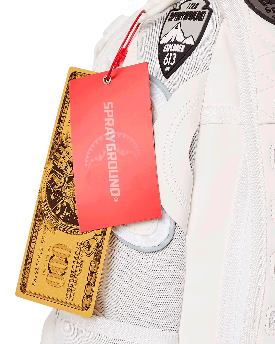 Dimensions: 18" x 6" x 11.5" • Front zipper pocket • Side pockets • Zippered Stash pocket • Separate velour sunglass compartment • Ergonomic mesh back padding • Adjustable Straps for custom sizing • Gold zippers with metal hardware • Metal "Sprayground Authentic" badge • Slide through back sleeve connects to carry-on luggage to free your hands