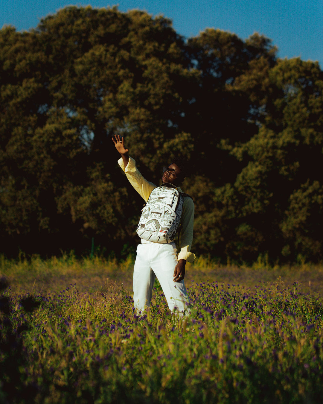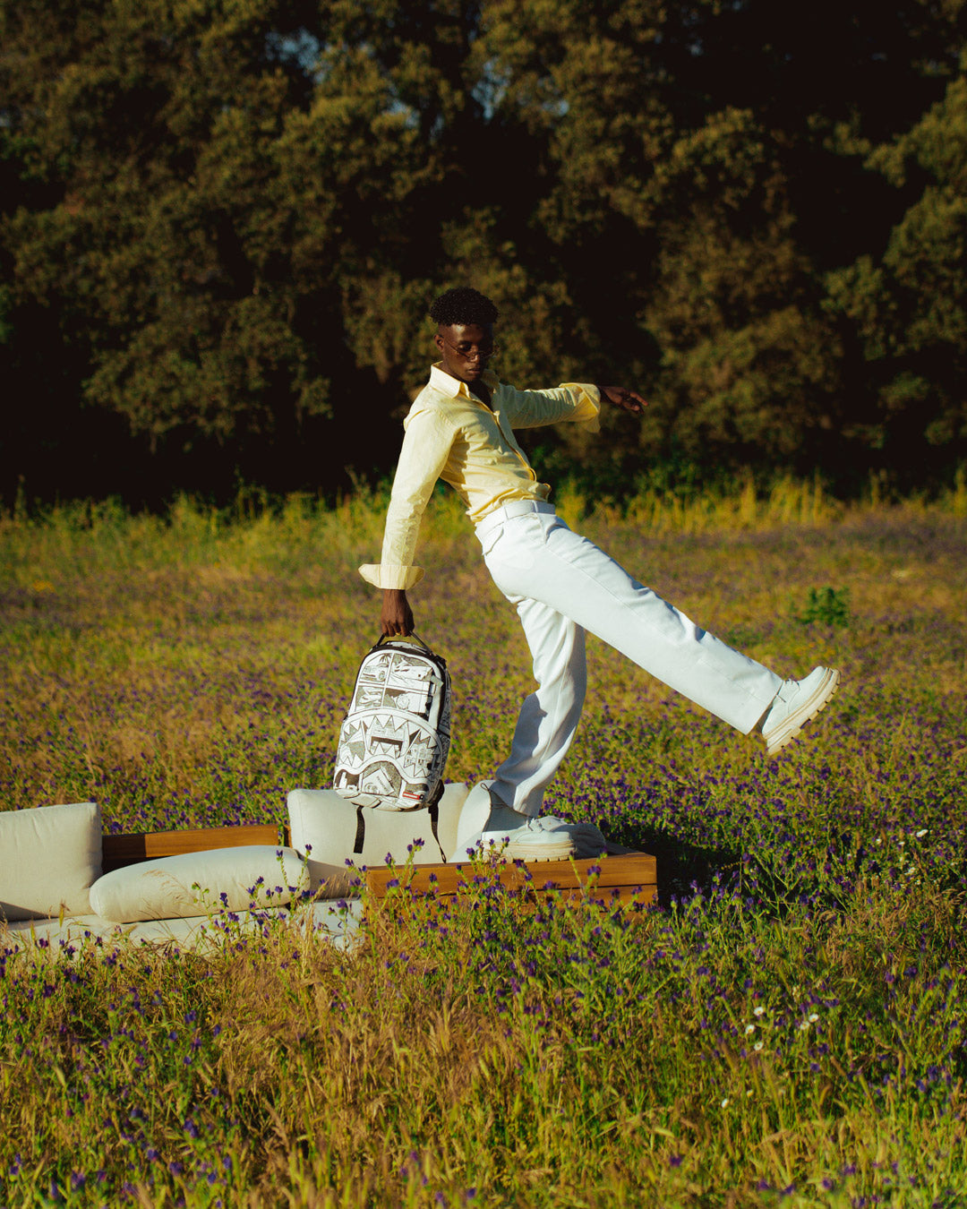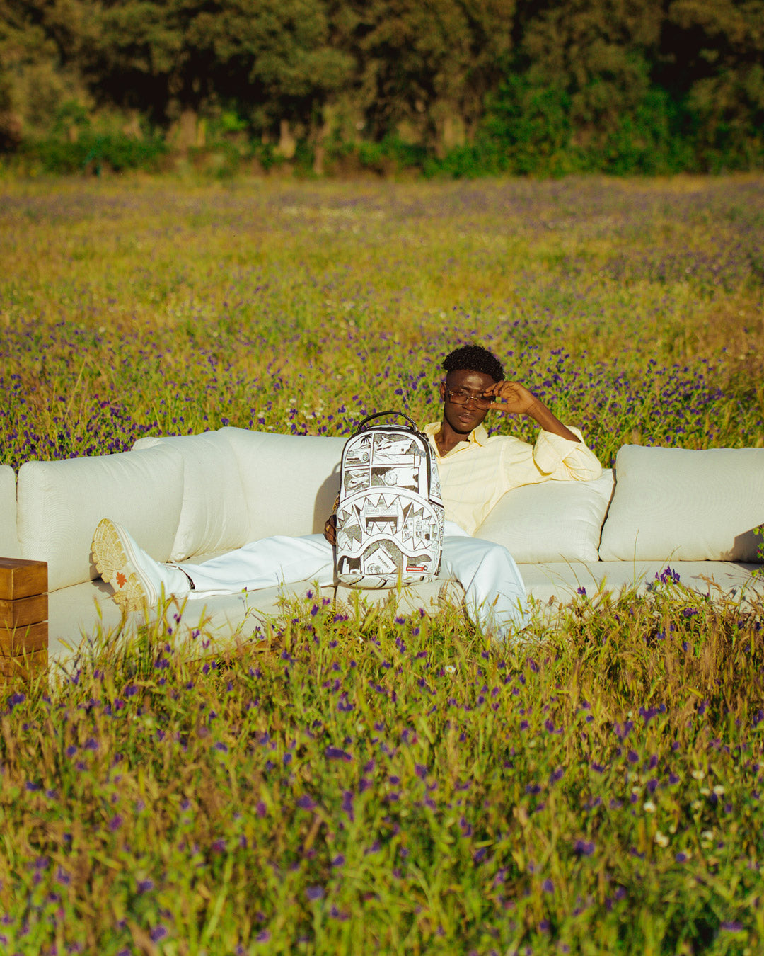 Dimensions: 18" x 6" x 11.5" • Front zipper pocket • Side pockets • Zippered Stash pocket • Separate velour sunglass compartment • Ergonomic mesh back padding • Adjustable Straps for custom sizing • Gold zippers with metal hardware • Metal "Sprayground Authentic" badge • Slide through back sleeve connects to carry-on luggage to free your hands