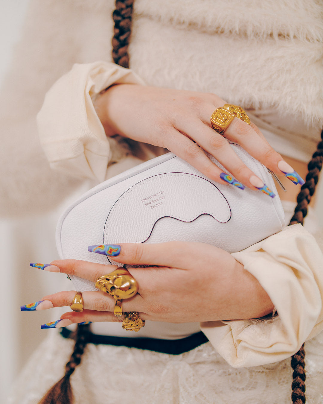 Cut and sew sharkmouth shape with embossed silver foil lettering.