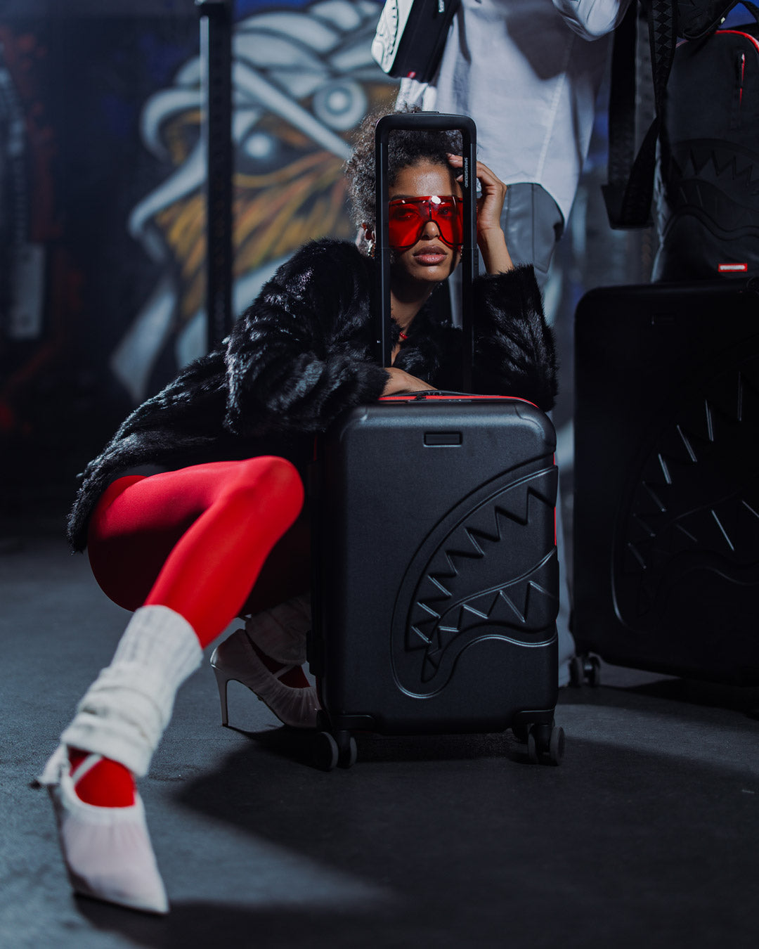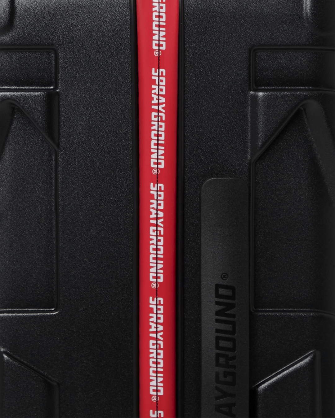 Features Sprayground logo printed zipper tape and an embossed sharkmouth