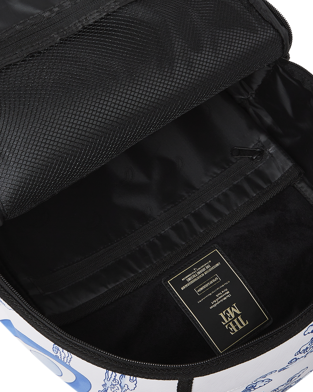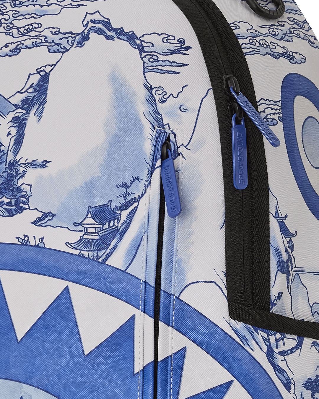 Sprayground’s signature shark mouth emerges from a Chinese landscape adapted from a late 17th-century vase in The Met collection. The Museum’s porcelain vase—an example of so-called Jingdezhen ware—commemorates a literary gathering in the 1690s at the city of Jingdezhen, a major production center of Chinese ceramics. The original vessel is richly decorated with local sites and figure groups, as well as poems and transcriptions of an essay. Collectively, they tell the true story of strangers becoming friends despite traditional class boundaries.