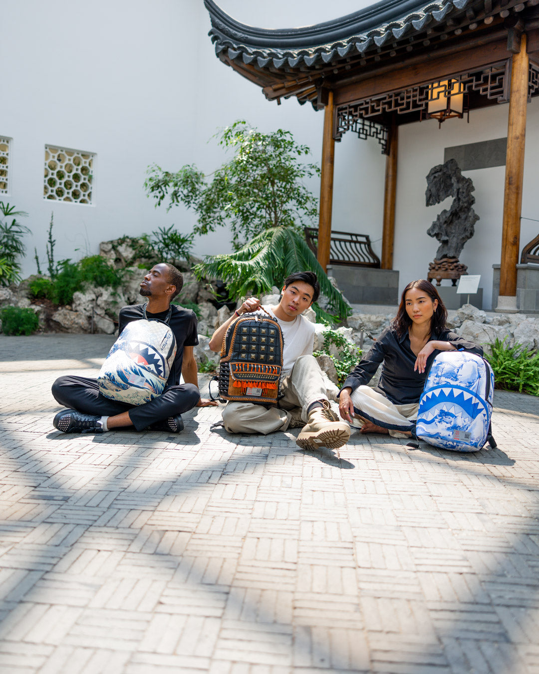 Dimensions: 18" x 6" x 11.5" • Front zipper pocket • Side pockets • Zippered Stash pocket • Separate velour sunglass compartment • Ergonomic mesh back padding • Adjustable Straps for custom sizing • Gold zippers with metal hardware • Metal "Sprayground Authentic" badge • Slide through back sleeve connects to carry-on luggage to free your hands