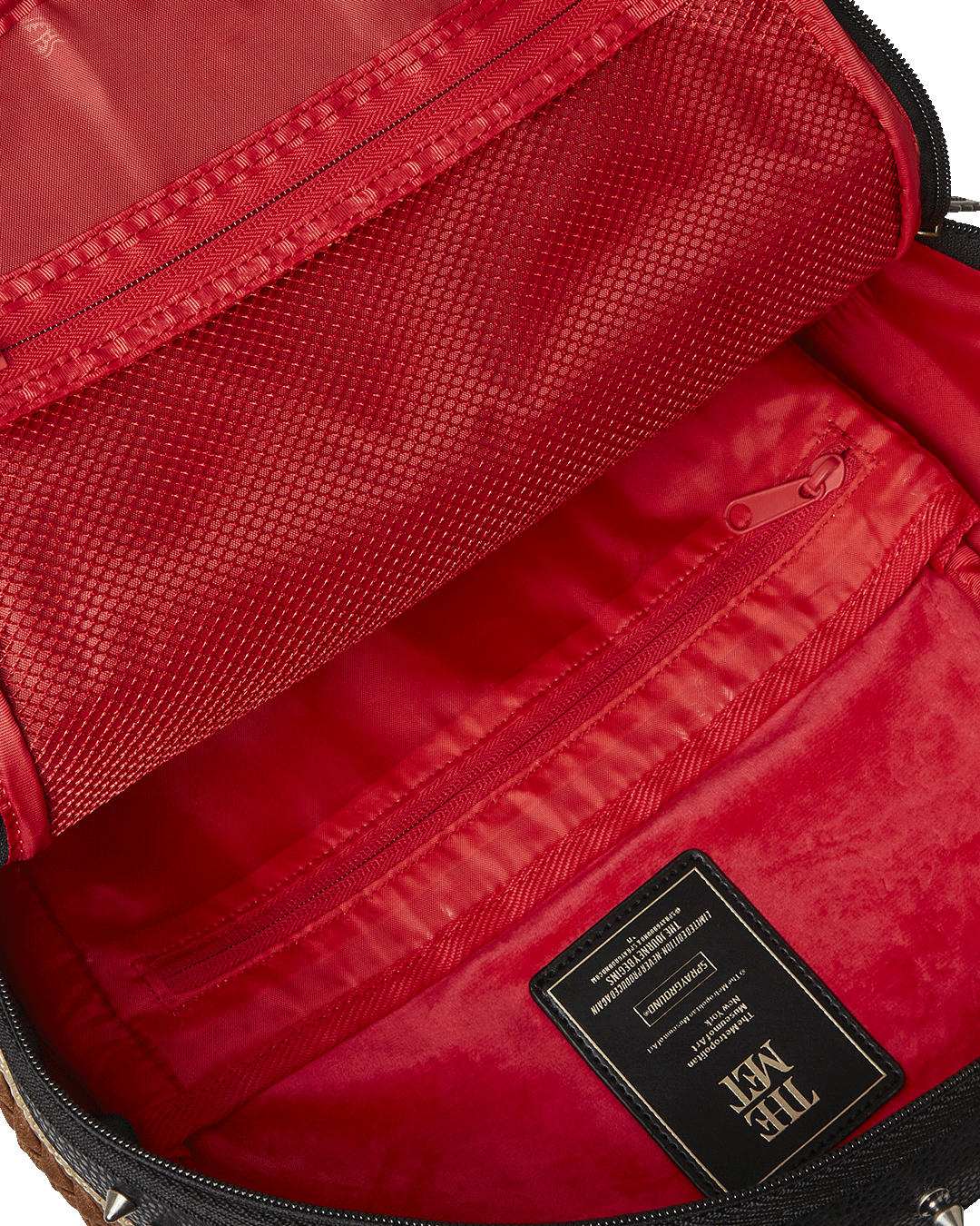 A spectacular suit of armor from 17th–18th-century Japan informs the studded design on this backpack. While this type of transportable “folding” armor, or tatami gusoku, was typically sported by low-ranking infantrymen, this particular example in The Met collection boasts gold lacquer detailing and silk brocade lining—unusually luxurious attributes suggesting that it was worn by a samurai.