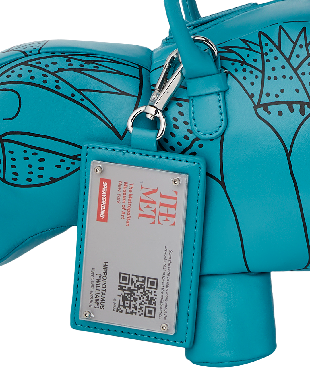 Since its arrival at The Met in 1917, the charming Egyptian hippopotamus figurine affectionately known as “William©” (ca. 1961–1878 BCE) has been a Museum favorite. This bag transforms William into a wearable work of art decorated with Sprayground’s signature shark mouth as well as lotus blossoms and marsh plants, symbols life and rebirth and a nod to the hippo’s habitat along the shallow banks of the Nile River.