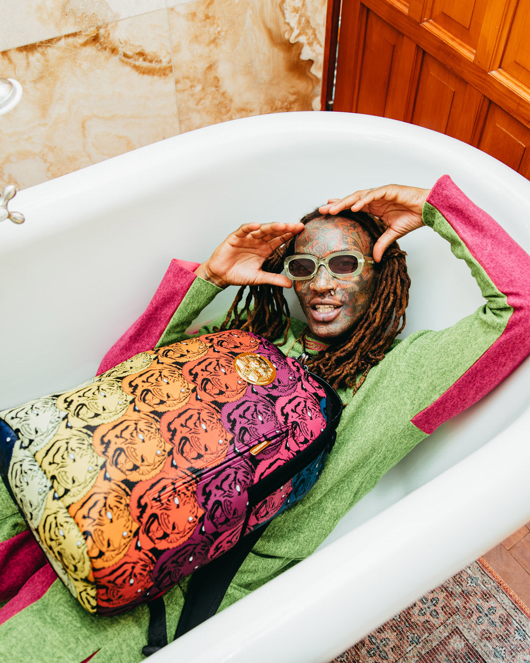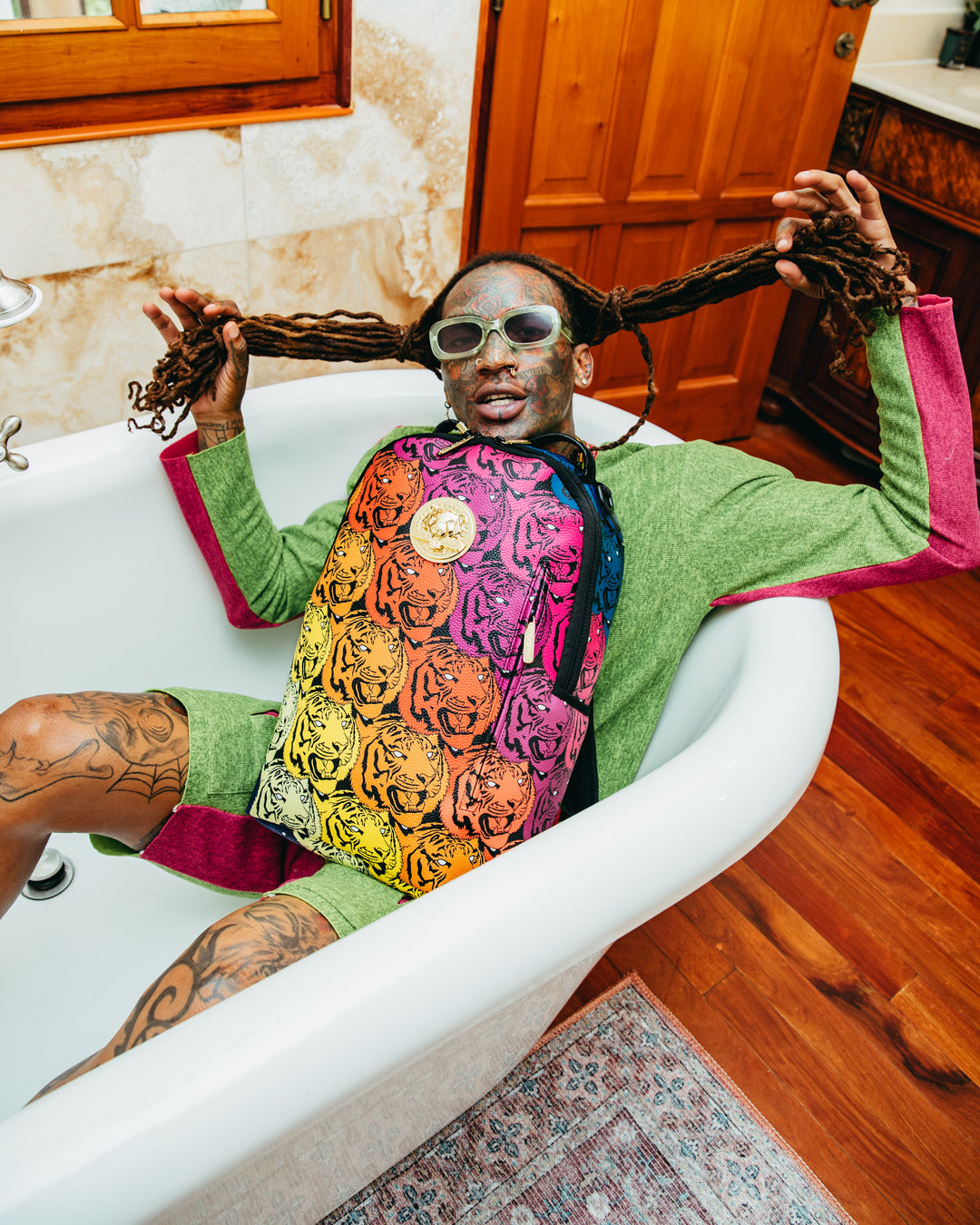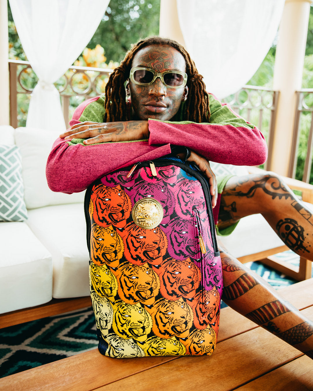 Dimensions: 18" x 6" x 11.5" • Front zipper pocket • Side pockets • Zippered Stash pocket • Separate velour sunglass compartment • Ergonomic mesh back padding • Adjustable Straps for custom sizing • Gold zippers with metal hardware • Metal "Sprayground Authentic" badge • Slide through back sleeve connects to carry-on luggage to free your hands