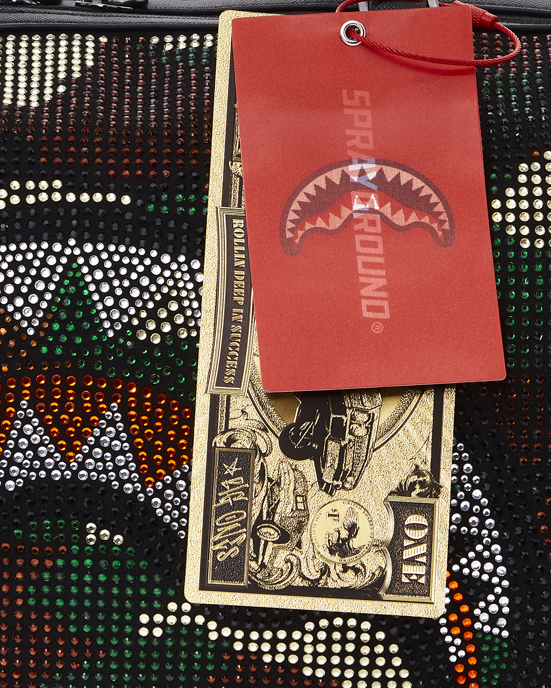 Dimensions: 8" x 7.5" x 13" • Metal zipper pocket• Back Zippers •Zippered sneaker pocket • gold zippers • Adjustable Straps for custom sizing •Metal Zippers with Metal Hardware • bag of Sprayground money