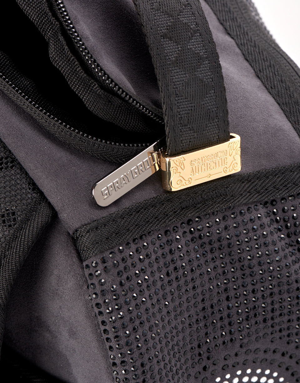 ExteriorDimensions: 18" x 6" x 11.5" • Front zipper pocket • Side pockets • Zippered Stash pocket • Separate velour sunglass compartment • Ergonomic mesh back padding • Adjustable Straps for custom sizing • Gunmetal zippers with metal hardware • Metal "Sprayground Authentic" badge • Slide through back sleeve connects to carry-on luggage to free your hands