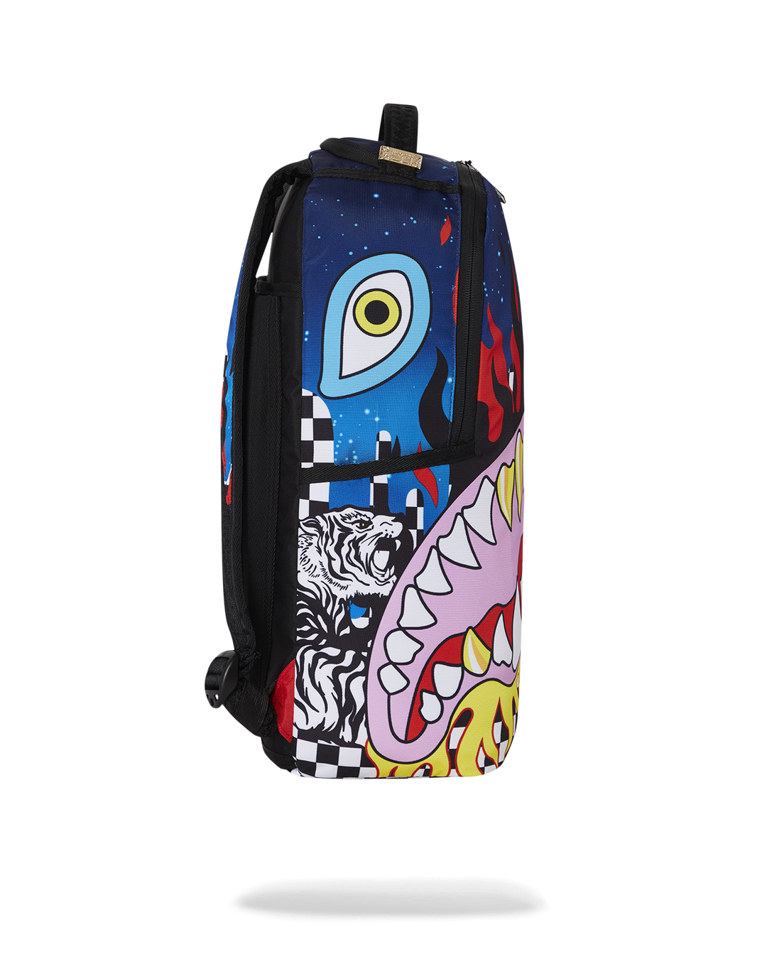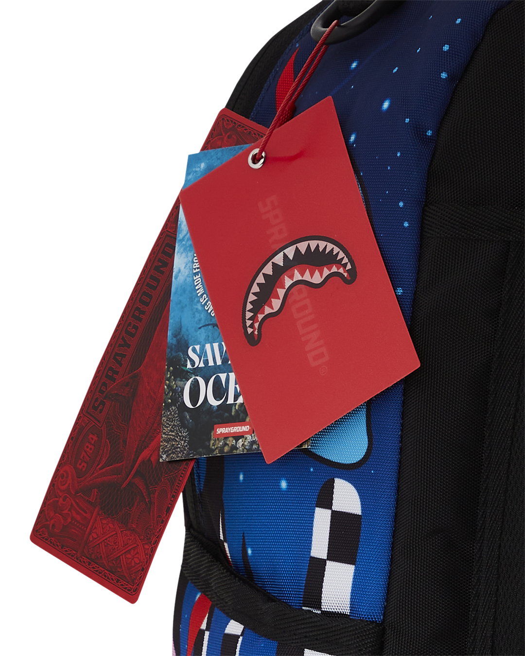 Dimensions: 18" x 6" x 11.5" • Front zipper pocket • Side pockets • Zippered Stash pocket • Separate velour sunglass compartment • Ergonomic mesh back padding • Adjustable Straps for custom sizing • Gold zippers with metal hardware • Metal "Sprayground Authentic" badge • Slide through back sleeve connects to carry-on luggage to free your hands