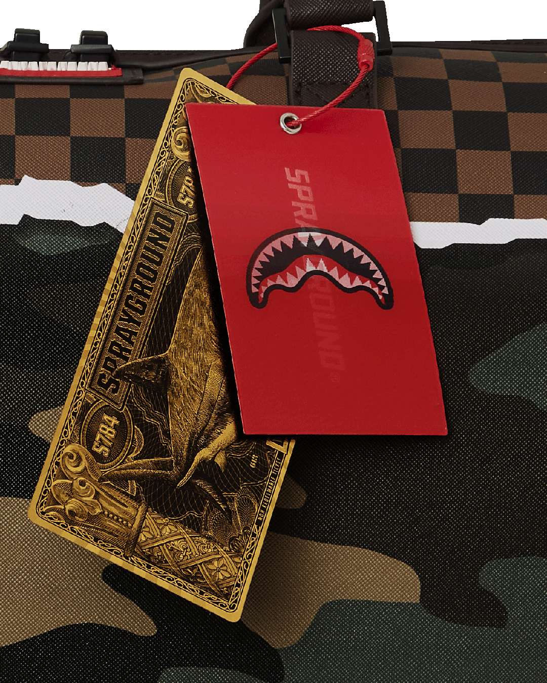 Dimensions: 20" x 10" x 10.75" • Metal zipper pocket• Back Zippers •Zippered sneaker pocket • gold zippers • Adjustable Straps for custom sizing •Metal Zippers with Metal Hardware • bag of Sprayground money