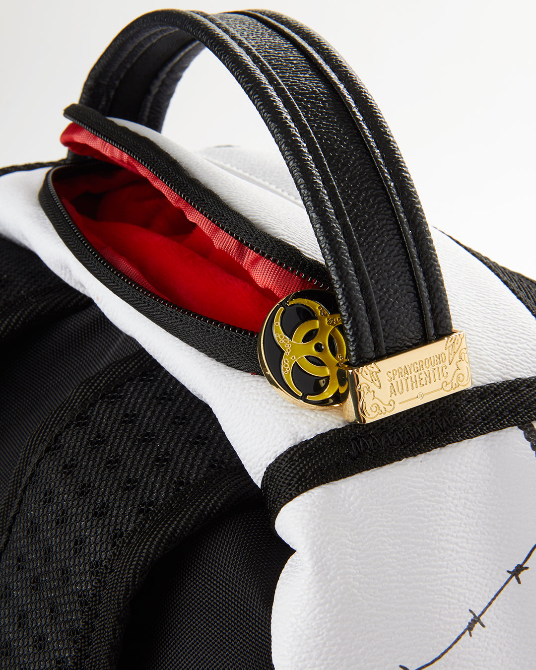 ExteriorDimensions: 18" x 6" x 11.5" • Front zipper pocket • Side pockets • Zippered Stash pocket • Separate velour sunglass compartment • Ergonomic mesh back padding • Adjustable Straps for custom sizing • Black zippers with metal hardware • Metal "Sprayground Authentic" badge • Slide through back sleeve connects to carry-on luggage to free your hands