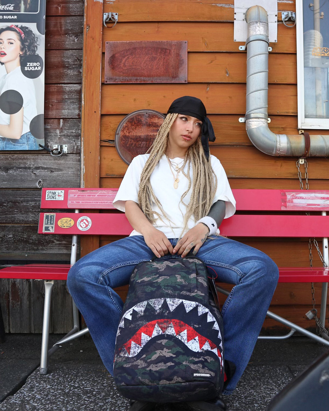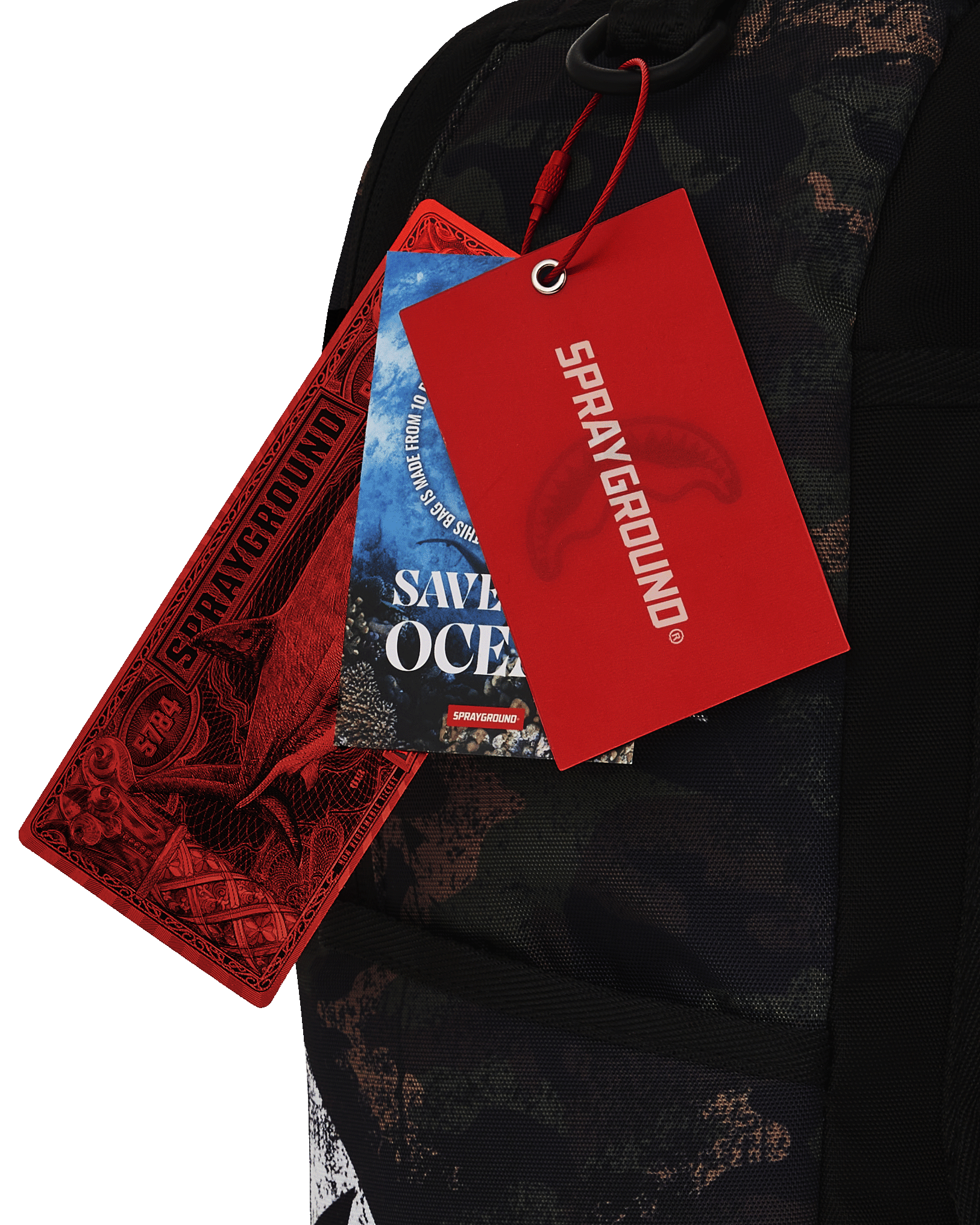 Dimensions: 18" x 6" x 11.5" • Front zipper pocket • Side pockets • Zippered Stash pocket • Separate velour sunglass compartment • Ergonomic mesh back padding • Adjustable Straps for custom sizing • Gold zippers with metal hardware • Metal "Sprayground Authentic" badge • Slide through back sleeve connects to carry-on luggage to free your hands