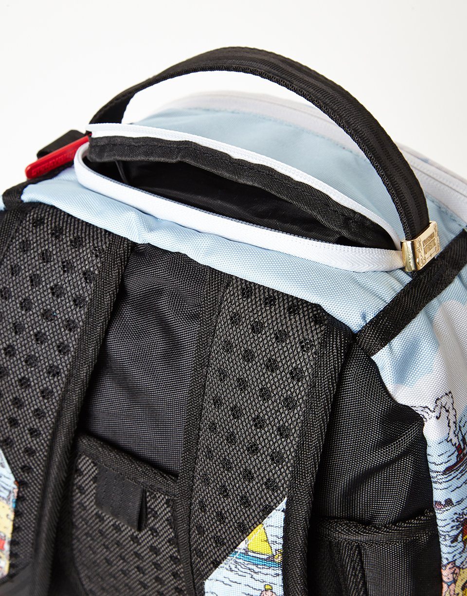 ExteriorDimensions: 18" x 6" x 11.5" • Front zipper pocket • Side pockets • Zippered Stash pocket • Ergonomic mesh back padding • Adjustable Straps for custom sizing • Nylon Zippers with Metal Hardware • Metal "Sprayground Authentic" badge • Slide through back sleeve connects to Carry on luggage to free your hands