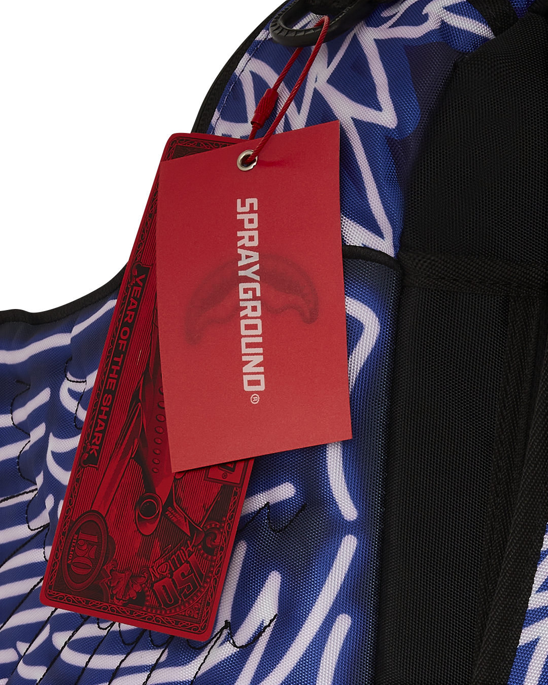 Dimensions: 18" x 6" x 11.5" • Front zipper pocket • Side pockets • Zippered Stash pocket • Separate velour sunglass compartment • Ergonomic mesh back padding • Adjustable Straps for custom sizing • Gold zippers with metal hardware • Metal "Sprayground Authentic" badge • Slide through back sleeve connects to carry-on luggage to free your hands