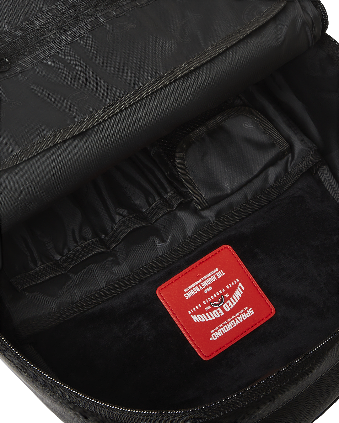 Dimensions: 18" x 6" x 11.5" • Front zipper pocket • Side pockets • Zippered Stash pocket • Separate velour sunglass compartment • Ergonomic mesh back padding • Adjustable Straps for custom sizing • Gold zippers with metal hardware • Metal "Sprayground Authentic" badge • Slide through back sleeve connects to carry-on luggage to free your hands