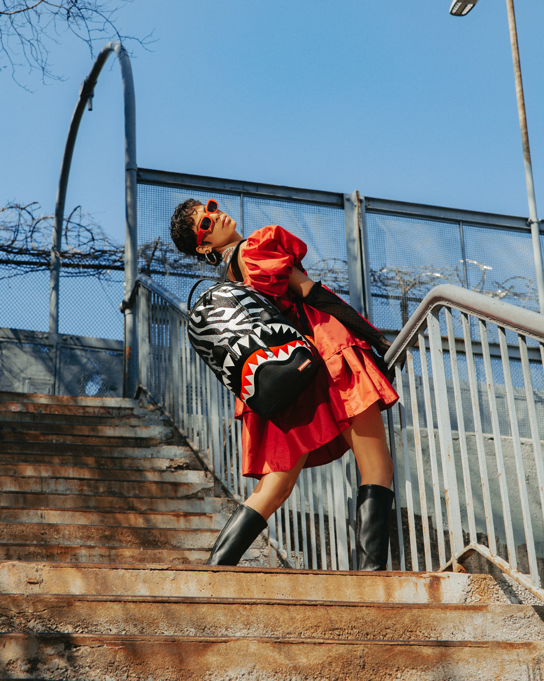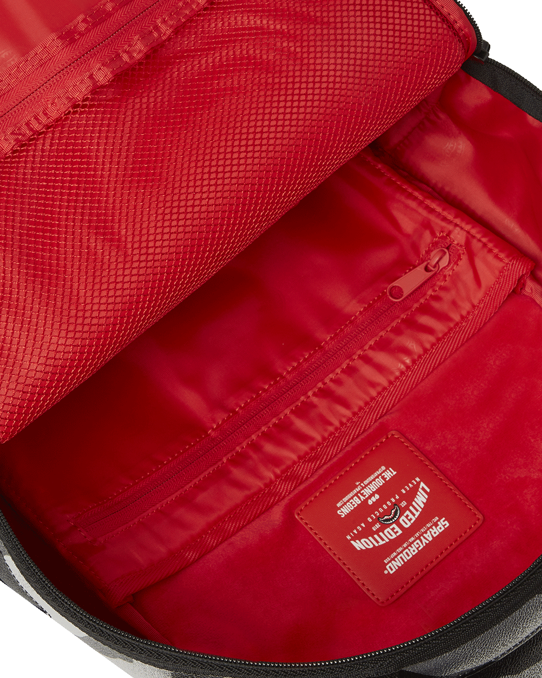 Dimensions: 18" x 6" x 11.5" • Front zipper pocket • Side pockets • Zippered Stash pocket • Separate velour sunglass compartment • Ergonomic mesh back padding • Adjustable Straps for custom sizing • Gold zippers with metal hardware • Metal "Sprayground Authentic" badge • Slide through back sleeve connects to carry-on luggage to free your hands